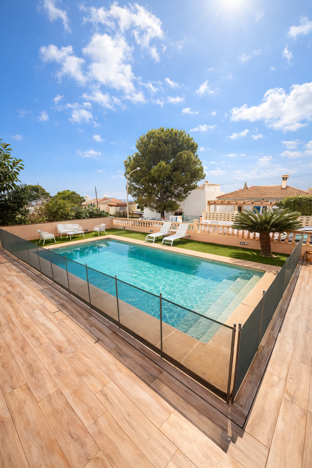 Verfügt über eine separate Küche, Waschküche, ein großes, sehr helles Wohnzimmer mit Oberlicht, 3 Schlafzimmer, 2 Badezimmer (eines davon en suite) und Zugang zu einer großen Veranda. Im Außenbereich befinden sich gepflegte Gärten und ein privater Pool von 5 x 8 Metern mit Sicherheitsbarriere für die Kleinsten, perfekt, um das mediterrane Klima zu genießen.